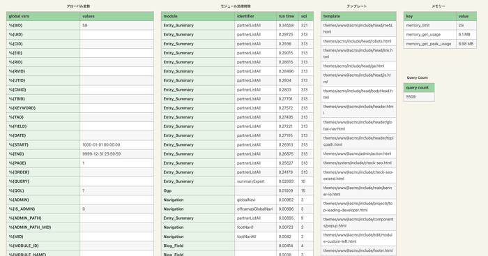 ここには、テンプレートに書かれている モジュール名と、その名前である モジュールID 、実際の実行時間に加え SQL を実行した回数が書かれています。ここではモジュールの実行時間は 0.001秒のような小さな数値であるのが正常で、0.2, 0.3秒のような時間がかかっているのは少し何か設定を見直した方がいい事がわかります。