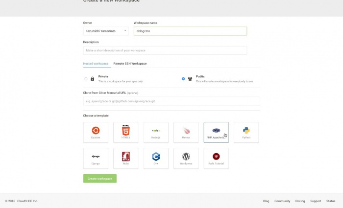PHPのマークのついてる「PHP , Apache &...」を選択して、(create workspace)のグリーンのボタンをクリックします。