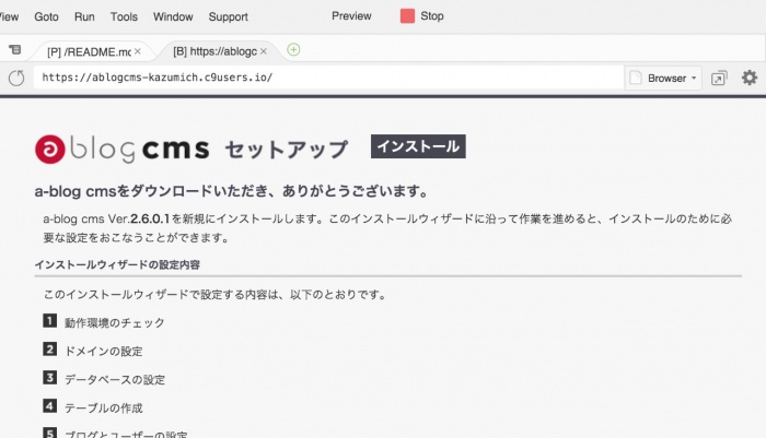 concrete5 の Katz さんに「Cloud9 はオススメだよー」って聞いて、動かせるかドキドキしながら a-blog cms の動作環境を作ってみた。