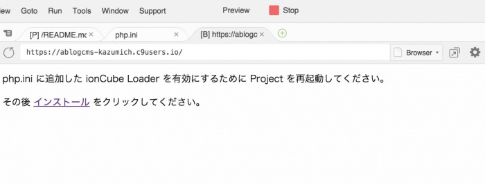 「php.ini に追加した ionCube Loader を有効にするために Project を再起動してください。」が表示されたら、もう少しで完了です。上の赤い STOP をクリックして、その後、緑の Run Project をクリックします。 で、インストール のリンクをクリックすると、インストーラーが起動するハズです。
