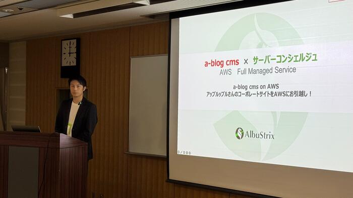 アルブストリクス株式会社の平山智則さんが登壇し、a-blog cms をAWS環境で利用する際の実例として、アップルップルのコーポレートサイトの移行事例を紹介しました。AWS環境への移行に関する具体的な設定項目やチューニングのポイントが詳しく解説され、参加者からの関心も高まりました。