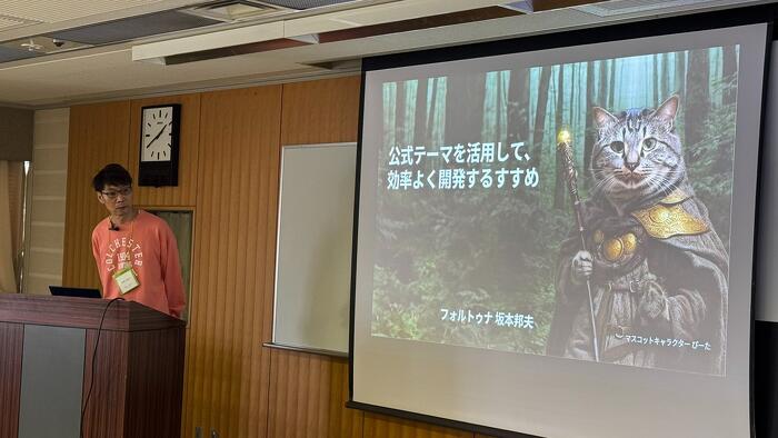 結構な確率で一番最初にお願いすることが多い フォルトゥナ 坂本 邦夫さん のセッションから始まりました。坂本さんは、公式テーマ「site」を使った開発の便利さと効率の良さについて語り、アクセシビリティにもかなり力が入っていると指摘されました。確かに、足りない部分もあるものの、多くの点で完成度が高く、すぐに使えるテーマとして評価が高いようです。