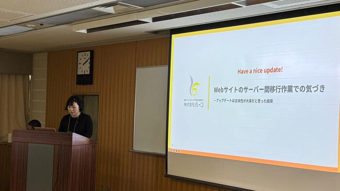 株式会社ルーコの川﨑絢加さんが登壇し、Webサイトのサーバー間移行作業における気づきについてお話しされました。川﨑さんは、a-blog cms 歴がまだ2年の若手ながら、この1年間で100サイト以上のサーバー移設を担当。その中で20サイトのアップデートも行ってきた経験を基に、現場でのリアルな課題や苦労をシェアしてくれました。