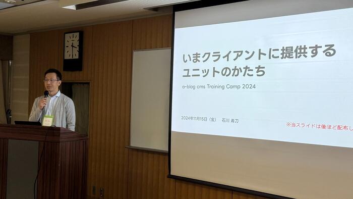 A-Systems株式会社の石川寿刀さんは、a-blog cmsのカスタムユニットを活用したクライアント対応について発表しました。a-blog cmsのユニット機能は柔軟にカスタマイズでき、更新担当者がスムーズに作業できるよう工夫されています。