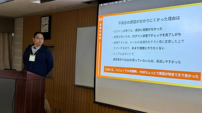 勝又さんは、特に古いカスタマイズに詳しい知識があれば、意外とスムーズに解決できるトラブルもあると強調されました。また、アップデート後の確認作業についても、「必ずログアウトした状態でチェックすること」が重要だと指摘。セッションでは、実際に問題に直面した事例をいくつか紹介し、どのように解決したのか具体的に説明がありました。