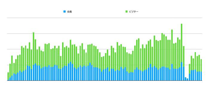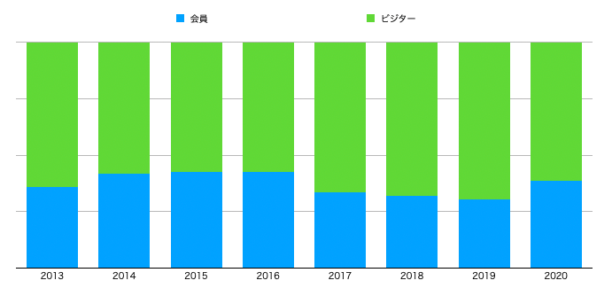 今年は会員の割合が増えているのは、ビジターの受け入れを止めている月があったり、ほとんどイベントを開催していない事から会員の利用が増えているように見えます。