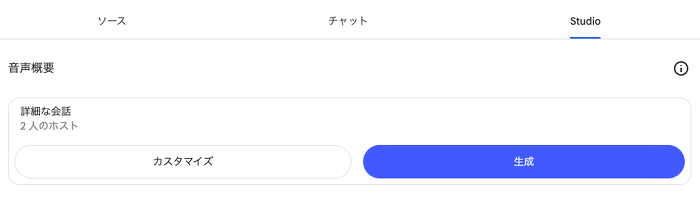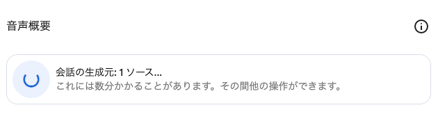 - ワンクリック生成 :Notebook Guide から Generate Audio Overview を押すだけで、資料の要点をホスト 2 名の対話形式で読み上げる 3 – 10 分の音声を自動生成。
