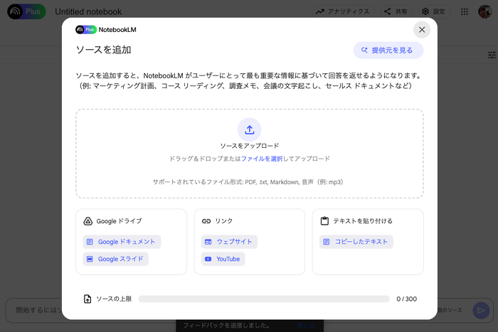 PDF やテキストファイルのアップロードや Google ドライブ 、ウェブサイトの URL 、もしくはテキストで指定して情報を追加する。ソースの上限は 300 となっている。