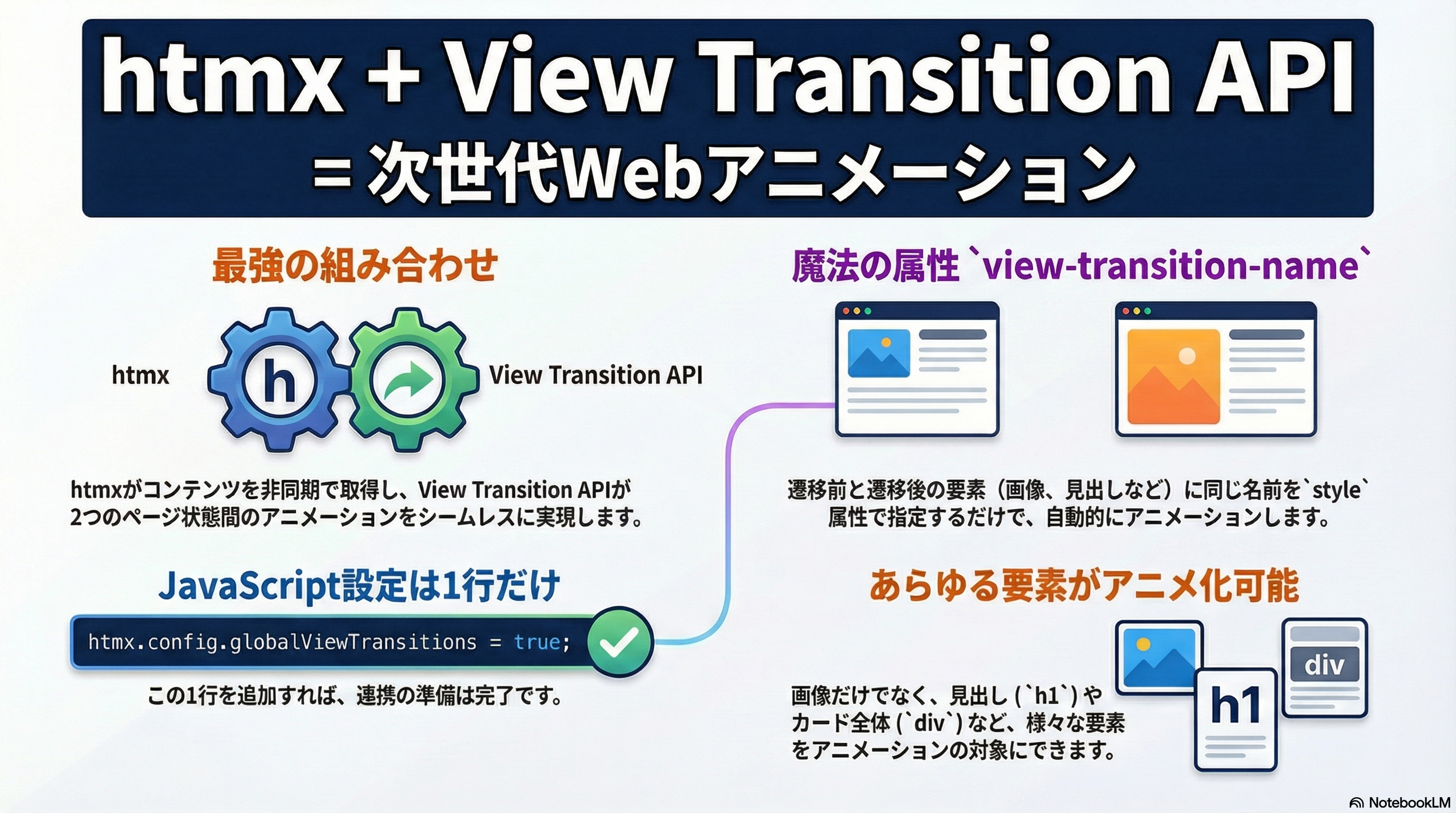 htmx を利用することで、基本的には JavaScript を書かずに、属性を書くだけで Ajax でコンテンツを更新ができるライブラリです。これと View Transitions API を組み合わせることで春に挫折したところをクリアすることができましたので書き残しておきます。