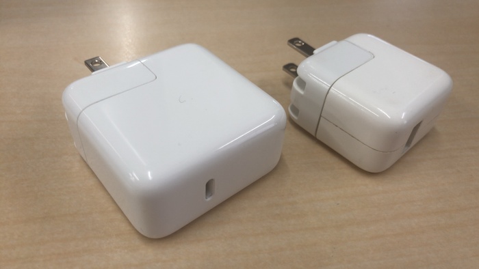 純正の ACアダプターは 29W で iPad の 12W のものと比べて少しだけ大きいくらいのサイズに USB-C のポートがあるものになります。特にアナウンスは無いまま、なぜか現在は 30W に変更になっているようです。