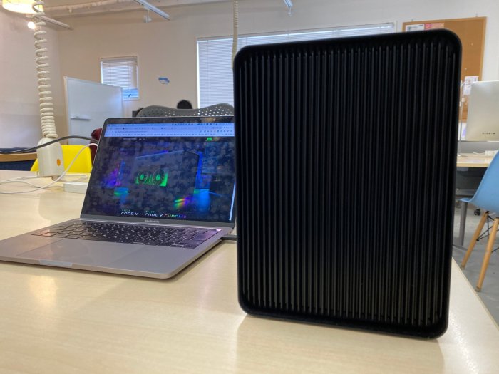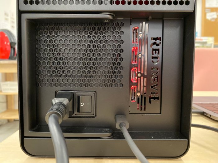 横から見ると、グラフィックボードが光っているのとファンが見えます。カッコはいいのですが、Mac がスリープしていても Thunderbolt3 が繋がっていると赤く光ったままになります。(消えて欲しい)
