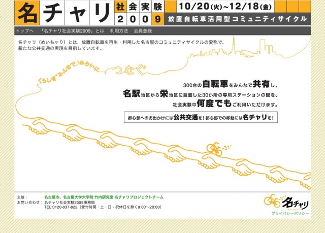 名古屋で同じ時期に2つの移動手段のレンタルが始まるような話を聞いたので紹介しておきます。1つは自転車で、もう1つは車です。 とりあえず、[名チャリ](http://meichari.jp/)については、数日前に会員登録をしておきました。[カリテコ](http://www.cariteco.com/)については、会費が必要になるようだし、ビートルもあり...