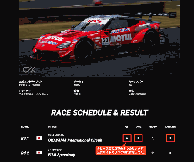 SUPER GT のサイトがリニューアルされていて、過去のリザルト の リンク先の URL が変わってしまっていた。 サイトのリニューアルする際には、外部から参照されることが多いサイトの場合には、しっかりリダイレクトをするなどを考えてもらいたいところですが、残念ながら対応できてないので、こちら側の修正で対応するこ...