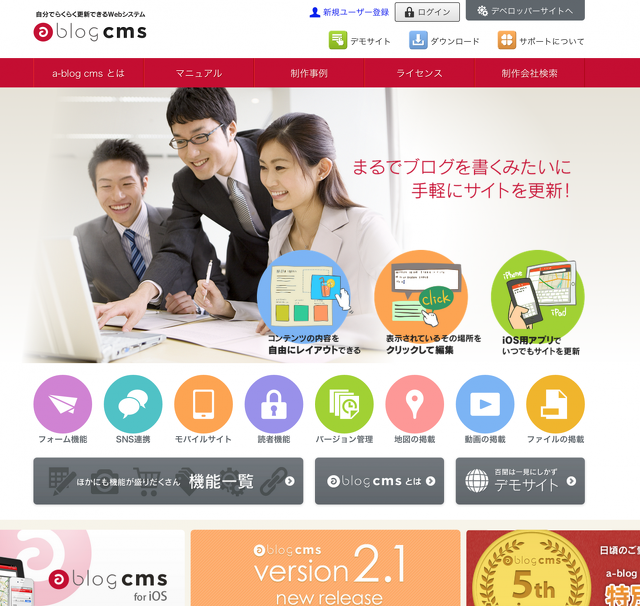 最初のバージョンを2009年6月23日にリリースして5年が経ちました。そして5歳の誕生日である2014年6月23日にVersion 2.1 をリリースしました。**この5年の間に320のWeb制作者に、1600サイト以上利用頂いております。ありがとうございます!** Version 2.1 の新しくなったところ こうやってリストにしてみると、a-blog cms...