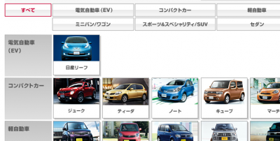 ニッサンのサイトでカーラインナップのボディータイプは「電気自動車(EV)/コンパクトカー/軽自動車/ミニバン・ワゴン/スポーツ&スペシャリティ・SUV/ゼダン」の6つに分かれている。