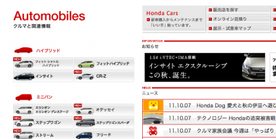 ホンダのサイトには車の一覧のコンテンツがなく、クルマのサイドエリアにジャンル毎に分けられて表示されています。「ハイブリッド/ミニバン/コンパクト/セダン/ワゴン/スポーツ・SUV/軽自乗用車/商用車/福祉車両/燃料電池電気自動車」の10個に分かれている。