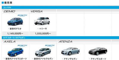 マツダのサイトでカーラインナップのボディータイプは「コンパクト/5ドアスポーツ・4ドアセダン/ミニバン/スポーツ/スポーツユーティリティビークル/ステーションワゴン/軽自動車/商用車/福祉車両」の9つに分かれている。