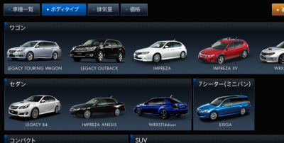 スバルのサイトで車両紹介・ボティタイプでは「ワゴン/セダン/7シーター(ミニバン)/コンパクト/SUV/スポーツ/軽自動車/福祉車両/特装車」と分かれている。