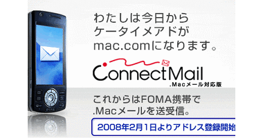 日本通信株式会社が、「.Mac」のメールを DoCoMoのケータイで iモードメールの代わり利用できるサービス「ConnectMail」を、2月1日より開始すると発表しています。 iPhone は DoCoMo になってしまうんだろうか? ...